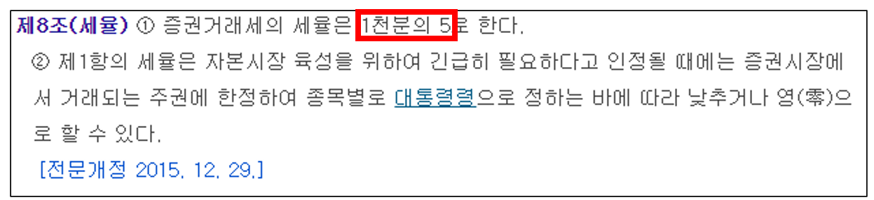 주식은 증권(권리를 담은 증서 혹은 문서)이라고 하죠. 증권거래세금은 '증권거래세법'으로 정해져 있습니다. 제8조(세율)를 보면,