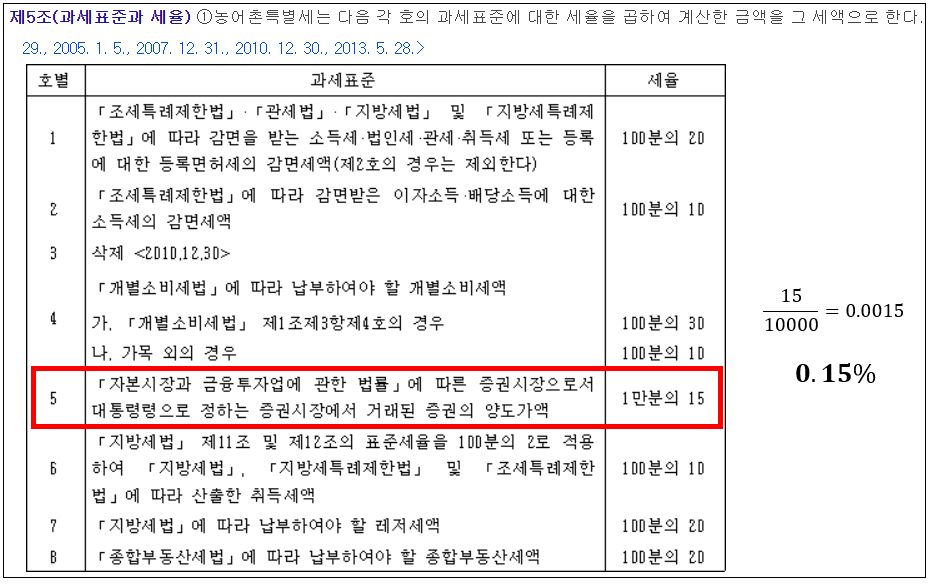 호별 5. '자본시장과 금융투자업에 관한 법률'에 따른 증권시장으로서 대통령령으로 정하는 증권시장에서 거래된 증권의 양도가액 세율 1만 분의 15