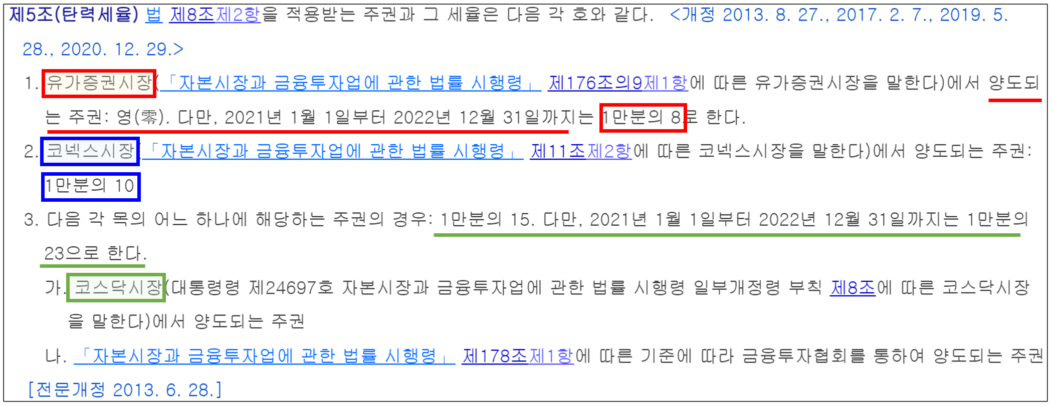 1. 유가증권시장(「자본시장과 금융투자업에 관한 법률 시행령」 제176조의9제1항에 따른 유가증권시장을 말한다)에서 양도되는 주권: 영(零). 다만, 2021년 1월 1일부터 2022년 12월 31일까지는 1만분의 8로 한다.