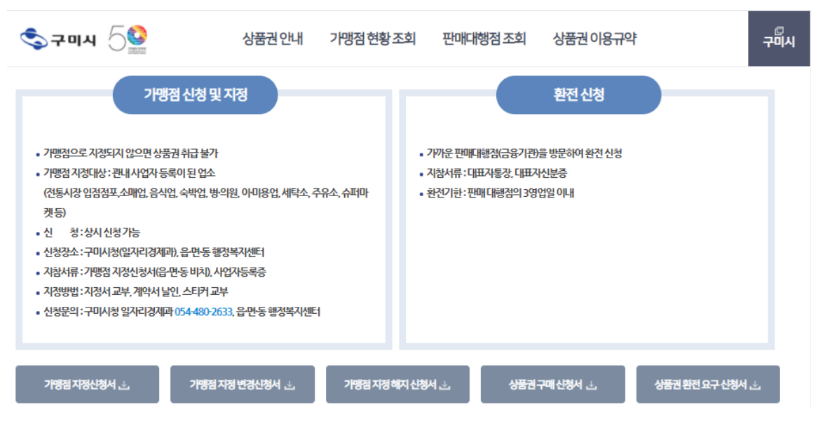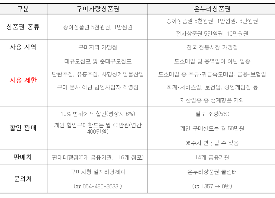 - 구미사랑 상품권은 지류형(5천 원권, 1만 원권), 카드형 2종이며 유효기간은 발행일로부터 5년입니다.