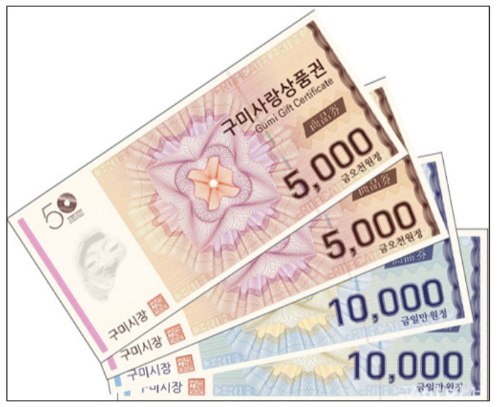 - 지역자금의 역외 유출 방지 및 지역경제 활성화를 위한 목적으로 구미시가 발행한 유가증권입니다. 구미 지역에서만 유통이 가능합니다.