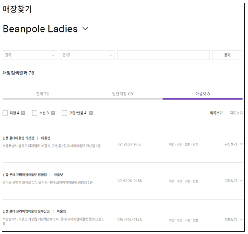 예를 들어 여성의류를 고르고 아울렛을 선택하면 빈폴 상설매장 리스트가 나타납니다.