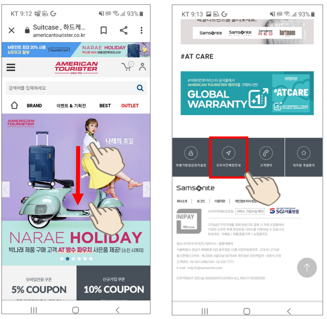 휴대폰에서도 아메리칸 투어리스트 아울렛 매장을 찾아볼 수 있습니다. 폰으로 홈페이지로 들어온 후, 화면을 가장 아래로 내려줍니다. '오프라인 매장안내'를 터치해 주면,