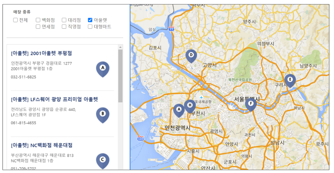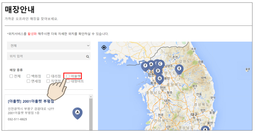 매장안내 창으로 들어왔습니다. 매장 종류에서 '아울렛' 콤보박스를 선택해 줍니다.