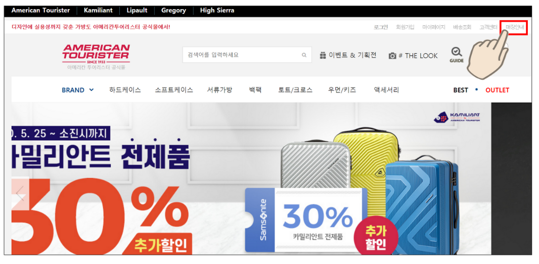 아메리칸 투어리스트 홈페이지로 들어가서 상단 오른쪽에 보이는 '매장안내'를 클릭합니다.