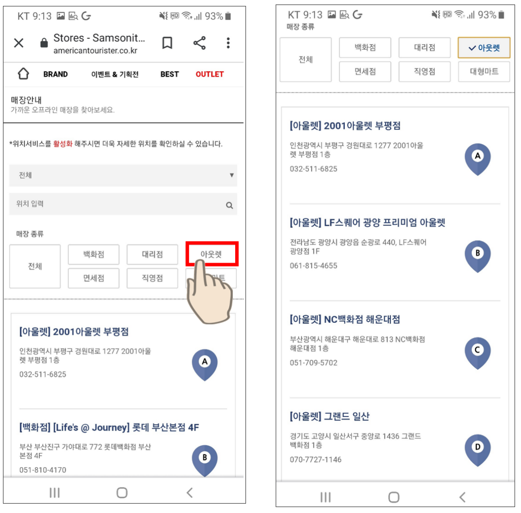 매장 종류를 고를 수 있습니다. '아웃렛'을 선택해주면 아메리칸 투어리스트 아울렛 매장이 검색됩니다.
